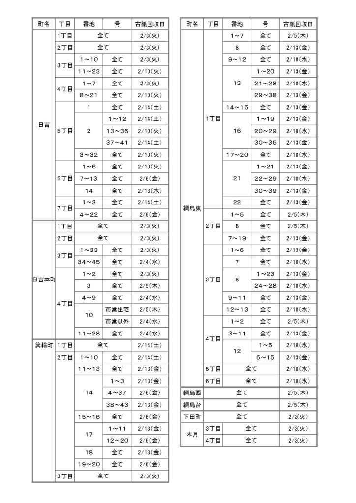 事前に折込チラシでもお伝えしますが、下記の住所一覧でお客様のご住所と配達区域を照らし合わせていただき、カレンダーで回収日のご確認をお願いいたします。